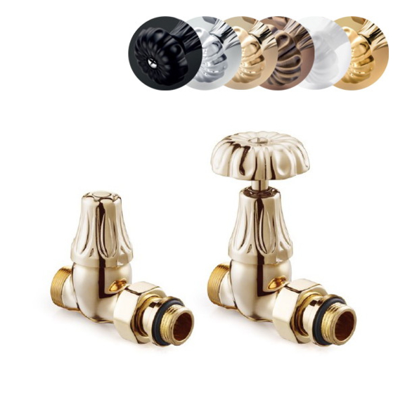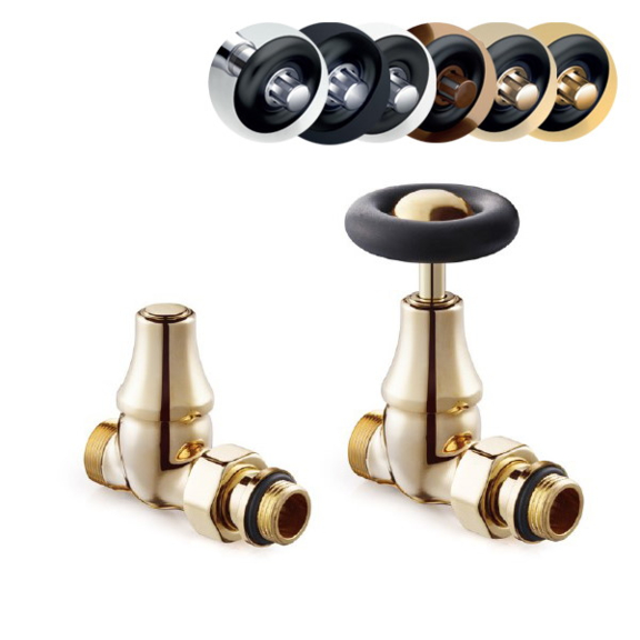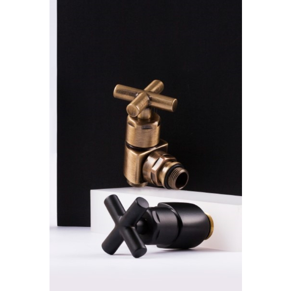 Manuelles Design-Eckventilset mit einer Abänderungsmöglichkeit zum thermostatischen Ventil – Paar 0385+0363 (ein Zuleitungsventil, ein Ableitungsventil und 2x Gewinde).