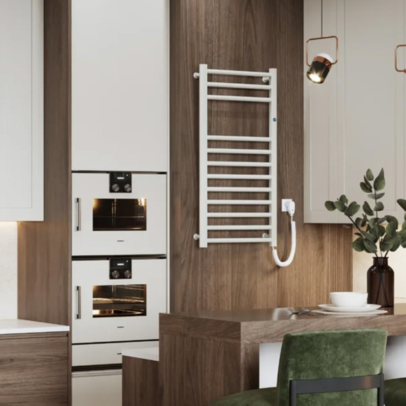 Eine effektive Lösung für jeden Raum dank seiner einfachen und reinen Form. Freier Raum zwischen Rohrteilen erleichtert das Hängen von Textilien zum Trocknen – praktische Lösung für eine Küche oder ein Badezimmer.